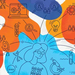 Illustration of woman looking at floating cells through a telescope